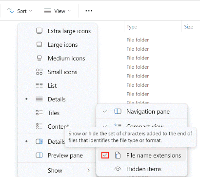 1-1 Orientation 2: Showing file name extensions in Windows Depending on your Windows version, use either the next exercise or the one after that to make file extensions visible. |