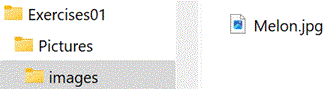 1-12 Example 2: Folder for an image file Here, the image file that will be embedded in the HTML file is located in the images subfolder. Its location is specified in the src attribute: <img src="images/Melon.jpg"> |