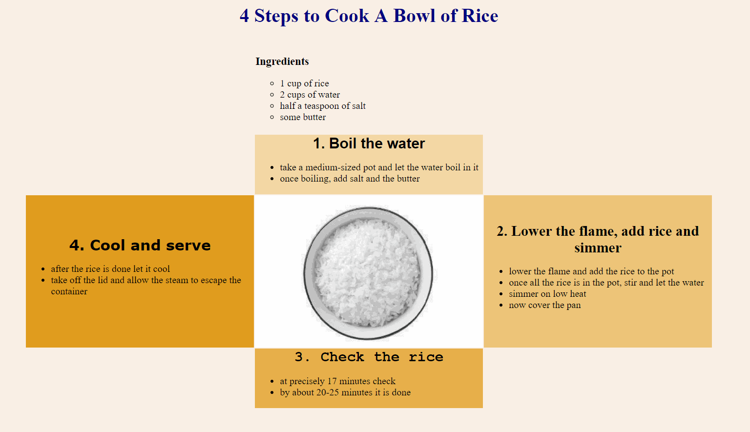 1-16 Orientation 2: Image of an HTML file: RicePreparationBrown.html So far, the code of starfruit HTML files you created in each exercise had to match exactly with the starfruit code HTML of the exercise.In the following sections, you will first open an image of an HTML file, and then proceed to generate an HTML file, based on the image. However, your HTML file doesn't have to precisely match the measurements of the image; it is fine if its size is slightly different. |